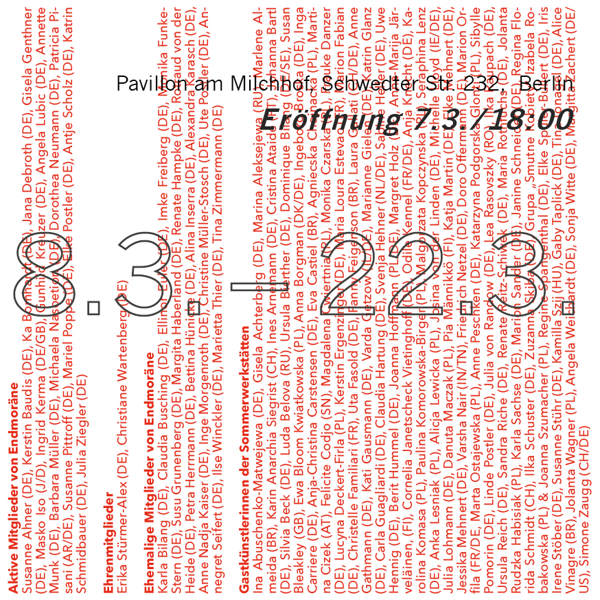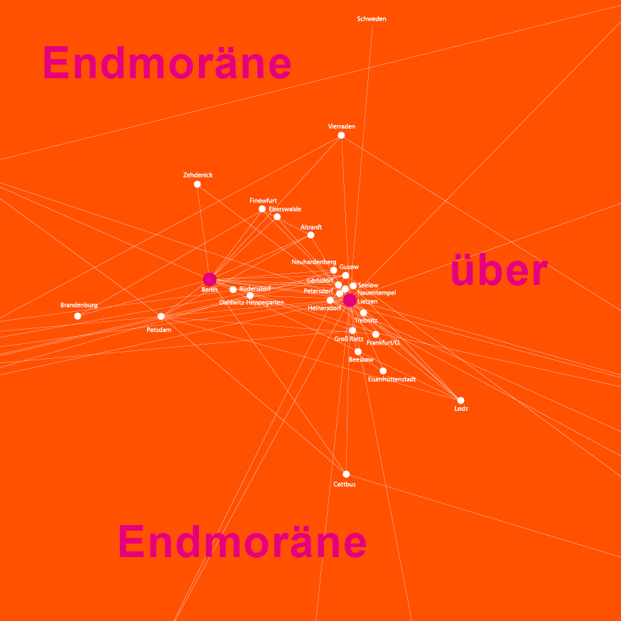 Die Idee der Ausstellung im Pavillon am Milchhof ist es, eine Art Rückkopplung herzustellen zwischen den ortsbezogenen Projekten in den ländlichen und urbanen Gebieten im Land Brandenburg und der Kunstrezeption Berlins und damit die Arbeit von Endmoräne in Berlin bekannter zu machen. Die Orte, die wir temporär bespielen, verlassen wir nach Ende der Ausstellung wie vorgefunden. Daher sind unsere Aktivitäten nach Projektabschluss ausschließlich auf unserer Website und auf Social Media sowie Doku-Broschüren und Katalogen oder als Blog auf unserer website zu verfolgen.